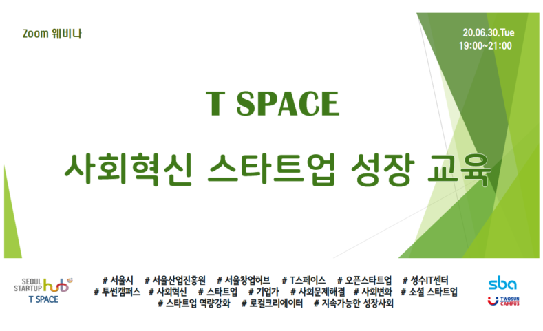 ◇[6월 30일 화요일] = [창업허브성수 T SPACE] 사회혁신 스타트업 성장 교육 : 3회차 = 서울시와 SBA에서 주최하고 투썬캠퍼스에서 주관하는 [창업허브성수 T SPACE] 사회혁신 스타트업 성장 교육 : 3회차가 오는 6월 30일 화요일 19시에 진행된다. 온라인 웨비나로 진행되는 이번 행사는 사회 문제 해결 혁신을 통한 스타트업의 성장을 돕기 위한 교육의 일환이다. 3회차를 맞이한 이번 행사에서는 △㈜컴퍼니들림 최윤영 대표가 연사로 나서 다양한 인사이트를 전할 예정이다. 이번 행사는 사회 혁신, 사회 문제 해결에 관심 있는 스타트업 관계자 누구나 참여할 수 있다.