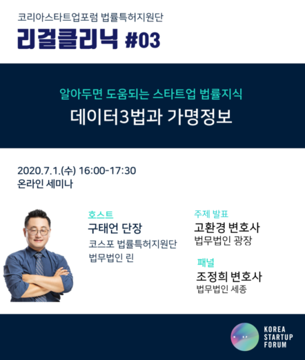 ◇[7월 1일 수요일] = 코스포 리걸클리닉 <스타트업을 위한 ‘데이터3법과 가명정보’ 법률 파헤치기!> = 코리아스타트업포럼에서 주최하는 코스포 리걸클리닉 <스타트업을 위한 ‘데이터3법과 가명정보’ 법률 파헤치기!>가 오는 7월 1일 수요일 16시에 진행된다. 온라인 웨비나로 진행되는 이번 행사는 데이터 3법과 가명정보에 대한 법적 이해를 통해 사업 적용에 필요한 핵심 내용을 공유하고, 전문가 패널단과 함께 질의응답을 하며 관련 법적 이슈에 대한 이야기를 나눠 보기 위해 마련됐다. 이번 행사에는 △코스포 법률특허지원단 구태언 단장과 △법무법인 광장 고환경 변호사, △법무법인 세종 조정희 변호사가 연사로 나설 예정이다. 이번 행사는 관심 있는 누구나 참여할 수 있다.
