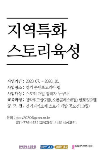 경기콘텐츠진흥원이 경기도의 숨은 이야기를 발굴하는 ‘지역특화스토리 육성 지원사업’을 운영한다. 교육과정은 실습 위주의 창작워크샵, 오픈클래스, 멘토링으로 구성되며 3개월 간 판교에 위치한 경기 콘텐츠코리아 랩에서 교육이 진행된다. 창작워크샵은 이야기 개발 경험이 있는 창작자를 대상으로 오는 7월 3차시, 총 12회에 걸쳐 운영되며 코로나19 확산에 따라 온라인을 통한 비대면 워크샵으로 운영한다.