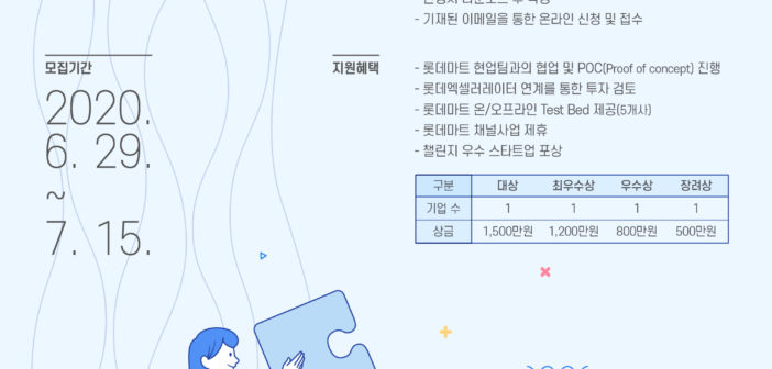 부산창조경제혁신센터는 롯데마트, 롯데액셀러레이터와 함께 리테일 기술을 가진 유망 스타트업을 발굴‧육성하기 위한 ‘롯데마트X부산창조경제혁신센터, 오픈이노베이션 챌린지 2020’참여 기업을 모집한다. 오픈이노베이션 챌린지 2020는 ‘리테일 테크(빅데이터, AI, VR/AR 등)’, ‘리테일 서비스(구독경제, 미디어커머스 등)’ 2가지 부문으로 나누어 모집할 계획이며 롯데마트에 제안할 기술 및 서비스를 가진 전국 소재의 7년 미만 스타트업이면 누구나 지원 가능하다. 선정된 기업은 8월부터 3개월 간 롯데마트 현업 팀과의 협업을 통해 실제 롯데마트 온‧오프라인 현장의 테스트베드 기회를 제공 받게 되며, 롯데마트와 롯데액셀러레이터를 통해 상시 멘토링 지원을 받게 된다. 테스트베드가 종료된 후 총 상금 4,500만원의 피칭 무대를 통해 최종 발표를 진행하고 결과에 따라 차등 지원된다. 또 우수 기업에 한해서는 롯데마트 채널 사업 제휴 및 롯데액셀러레이터 투자 연계 등이 검토 될 계획이다. 참여 희망 기업은 오는 7월 15일 까지 부산창조경제혁신센터 홈페이지를 통해 신청할 수 있으며 서류평가 및 발표평가를 통해 최종 5개사가 선정 될 계획이다.