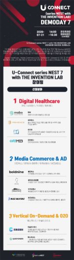 ◇[7월 21일 화요일] = U-Connect(series NEST with THE INVENTION LAB) 데모데이= 신용보증기금과 Startup NEST의 액셀러레이팅 파트너사 더인벤션랩이 주최하는 U-Connect(series NEST with THE INVENTION LAB) 데모데이가 오는 7월 21일 화요일 14시에 진행된다. 온라인 웨비나로 진행되는 이번 행사는 신용보증기금과 더인벤션랩이 공동으로 주관하는 NEST 7기 선정 10개 스타트업 팀의 데모데이다. 이번 행사에는 디지털 헬스케어(Digital Healthcare), 미디어 커머스 & 광고(Media Commerce & AD), 버티컬 온디멘드 플랫폼(Vertical On-Demand & O2O)세 분야에서 고객 경험 혁신을 이끌어 가는 유망 초기 스타트업들이 참여한다.