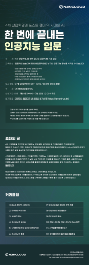 ◇[7월 23일 목요일] = [온라인 무료 AI 세미나] 한번에 끝내는 인공지능 입문= 엔쓰리엔클라우드에서 주최하는 [온라인 무료 AI 세미나] 한번에 끝내는 인공지능 입문이 오는 7월 23일 목요일 14시에 진행된다. 온라인 웨비나로 진행되는 4차 산업혁명 시대를 대비하여 누구나 인공지능을 쉽게 이해하고, 인공지능을 구현하는 기능을 수행해 볼 수 있는 시간을 갖기 위해 마련됐다. 이번 행사는 4차 산업혁명, 한 번에 끝내는 인공지능 기초 입문을 주제로 입문자의 눈높이에 맞춰 진행된다. 이번 행사에서는 △포스트 팬데믹 시대의 AI, △데이터와 빅데이터, △AI 발전 역사, △머신러닝과 딥러닝, △다양한 머신러닝 딥러닝 프레임워크, △머신러닝의 종류, △머신러닝 필수 용어와 수학 개념, △머신러닝의 워크플로우, △머신러닝의 학습, △ANN, DNN, CNN, RNN, GAN이란, △AI 학습 플랫폼 둘러보기에 대한 강연과 질의응답이 진행된다. 이번 행사는 인공지능을 처음 접하는 일반인, 비전공자, 기업 실무자, 대학생 등 인공지능의 기초부터 쉽게 이해하고 싶은 누구나 신청 가능하다. 웨비나에 대한 자세한 내용 확인과 참가 신청은 이곳에서 할 수 있다.