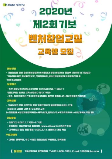 기술보증기금(이하 기보)이 예비창업자 및 초기창업자의 성공창업 견인을 위해 2020년 제2회 벤처창업교실교육생을 8월 7일까지 모집한다고 밝혔다.