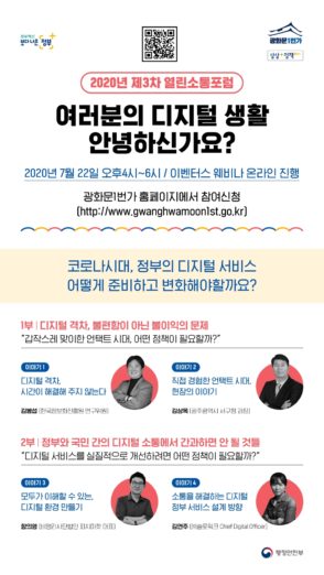◇[7월 22일 수요일] = 2020년 제3차 열린소통포럼 “코로나시대 정부 디지털서비스의 변화” = 행정안전부가 주최하는 2020년 제3차 열린소통포럼 “코로나시대 정부 디지털서비스의 변화”가 오는 7월 22일 수요일 16시에 진행된다. 온라인 웨비나로 진행되는 이번 행사는 코로나시대, 디지털 약자를 위해 정부 서비스는 어떻게 변화해야 할지 디지털 격차 해소에 대해 논의해 보고자 마련됐다. 이번 행사의 1부는 디지털 격차, 불편함이 아닌 불이익 문제를 주제로 진행되며, △한국정보화진흥원 김봉섭 연구위원, △광주광역시 서구청 김상옥 과장이 발제자로 참여한다. 이어 2부는 정부와 국민 간의 디지털 소통에서 놓치면 안 될 것들을 주제로 진행되며, △비영리사단법인 피치마켓 함의영 대표, △㈜슬로워크 김연주 CDO가 발제자로 참여한다.