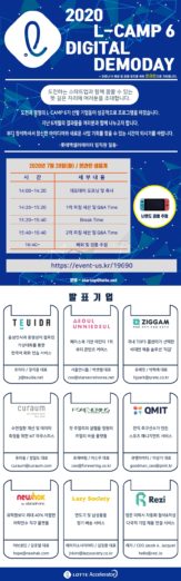 ◇[7월 28일 화요일] = 롯데액셀러레이터 L-CAMP 6기 온라인 데모데이 = 롯데액셀러레이터가 주최하는 L-CAMP 6기 온라인 데모데이가 오는 7월 28일 화요일 14시에 진행된다. 온라인 웨비나로 진행되는 이번 행사는 L-CAMP 6기에 선발된 유망 스타트업 9개 팀의 지난 6개월 동안의 성과를 공개하는 자리다. 이번 행사에서는 △트이다(음성인식과 동영상이 접목된 가상대화를 통한 한국어 회화 연습 서비스), △서울언니들(페이스북 기반 미얀마 1위 뷰티 콘텐츠 커머스), △큐레잇(국내 TOP3 콜센터가 선택한 비대면 채용 솔루션 ‘직감’), △큐라움(수면질환 개선 및 데이터 측정을 위한 IoT 마우스피스), △포에버링(첫 주얼리의 설렘을 영원히, 주얼리 바꿈 플랫폼), △큐엠아이티(전직 축구 선수가 만든 스포츠 매니지먼트 서비스), △어브로딘(유학원보다 최대 40% 저렴한 어학연수 직구 플랫폼), △레이지소사이어티(면도기 및 남성용품 정기 배송 서비스), △레지(영문 이력서 자동화 첨삭&작성 다국적 기업 채용 연결 서비스)가 발표에 참여한다. 이번 행사는 관심 있는 누구나 참여 가능하다.