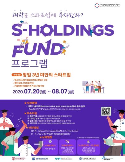 S-HoldingsFund 프로그램은 7/20일부터 8/7일까지 약 3주간 창업기업을 모집한다. 세부 내용은 프로그램에 참여하는 각 대학기술지주회사 홈페이지 및 서울창조경제혁신센터 홈페이지에서 확인 가능하다.