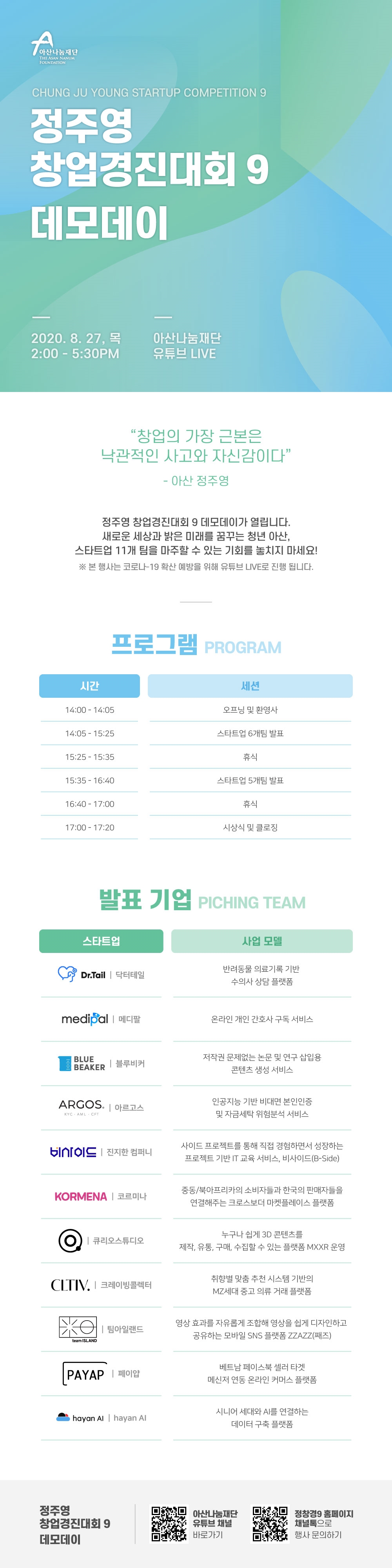◇[8월 27일 목요일] = 정주영 창업경진대회 9 데모데이 = 아산나눔재단이 주최하는 정주영 창업경진대회 9 데모데이가 오는 8월 27일 목요일 14시에 진행된다. 온라인 웨비나로 진행되는 이번 행사는 전국에 기업가정신과 창업 문화를 확산하고, 유망한 스타트업을 발굴하여 지원하는 아산나눔재단의 실전형 창업 지원 프로그램인 정주영 창업경진대회 9회에 선발된 스타트업 11개 팀의 열정과 비전을 만나볼 수 있는 자리다. 이번 행사는 관심 있는 누구나 참여 가능하다.
