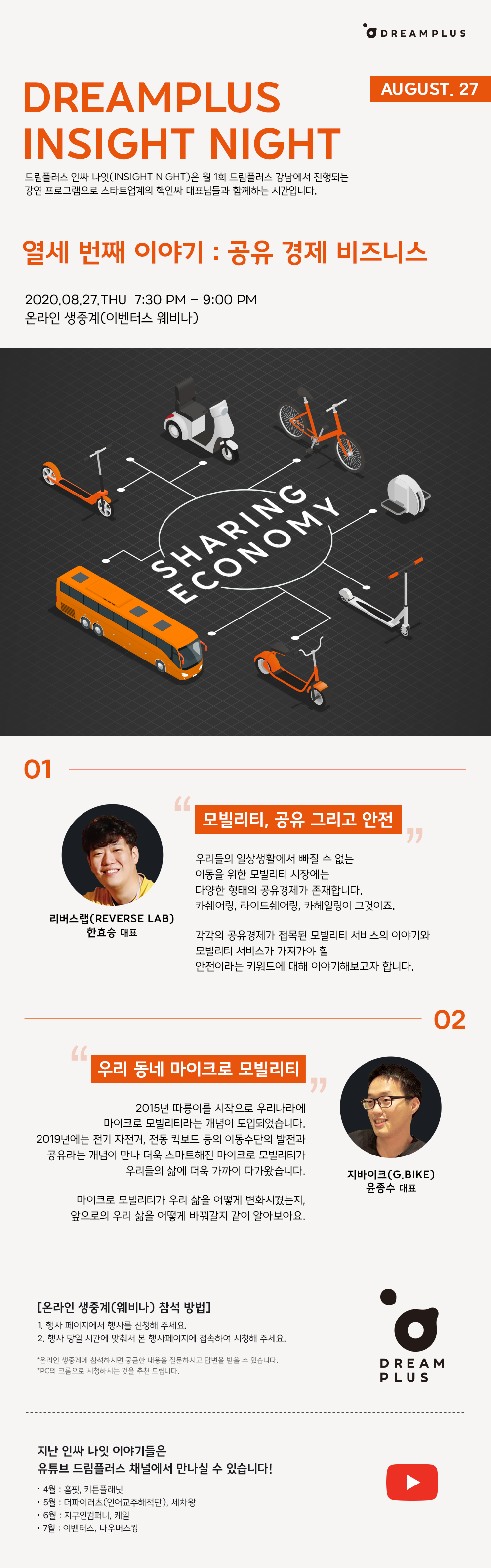 ◇[8월 27일 목요일] = 한화 드림플러스 인싸 나잇(INSIGHT NIGHT): 공유 경제 비즈니스 편(리버스랩, 지바이크) = 한화 드림플러스가 주최하는 드림플러스 인싸 나잇(INSIGHT NIGHT): 공유경제 비즈니스 편(리버스랩, 지바이크)이 오는 8월 27일 목요일 19시 30분에 진행된다. 온라인으로 진행되는 이번 행사는 월 1회 강남 드림플러스에서 진행되는 강연 프로그램으로 비즈니스 업계를 선도한 스타트업 대표의 이야기를 듣는 인사이트 토크쇼다. 이번 회차는 인싸 나잇의 열세 번째 회차로 공유 경제 비즈니스를 주제로 삼았다. 이번 행사에는 △리버스랩(Reverse Lab) 한효승 대표와 △지바이크(G.Bike) 윤종수 대표가 연사로 참여해 모빌리티 서비스에 대한 이야기를 전해 줄 예정이다.
