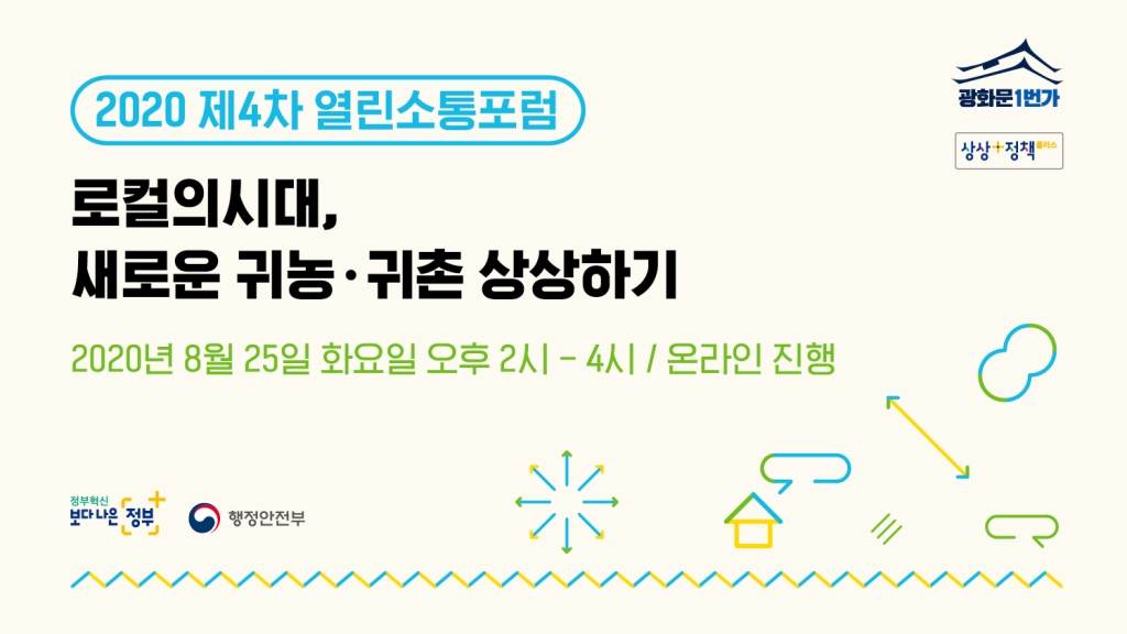 ◇[8월 25일 화요일] = 2020년 제4차 열린소통포럼 “로컬의 시대, 새로운 귀농·귀촌 상상하기” = 행정안전부가 주최하는 2020년 제4차 열린소통포럼 “로컬의 시대, 새로운 귀농·귀촌 상상하기”가 오는 8월 25일 화요일 14시에 진행된다. 온라인 웨비나로 진행되는 이번 행사는 현시대에 걸맞은 귀농·귀촌과 로컬 지향적인 삶에 고민해 보며 이를 위해 필요한 정책에 대해 함께 의논해 보고자 마련됐다. 이번 행사에서는 귀농·하신 분들의 경험담을 바탕으로 귀농·귀촌 정책이 어떻게 변화해 왔으며, 어떤 미래를 준비해야 하는지, 지속가능한 지역살이를 위해 무엇이 더 필요한지를 함께 논의할 예정이다.