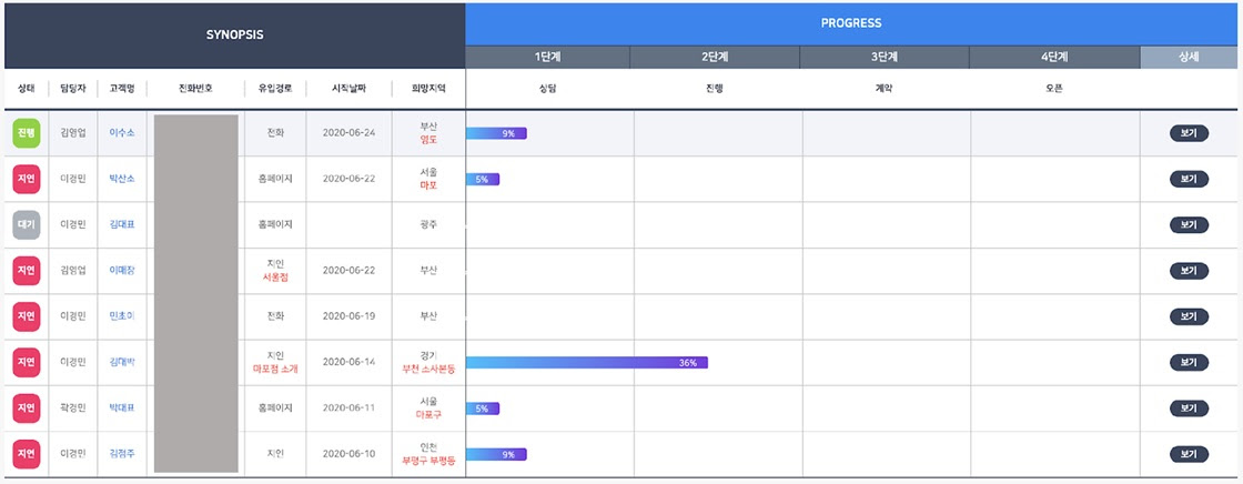 새롭게 추가된 가맹 개설 관리 기능은 가맹점 영업 단계부터 개설까지 각 프로세스 별 진행 현황을 확인할 수 있는 시스템이다.