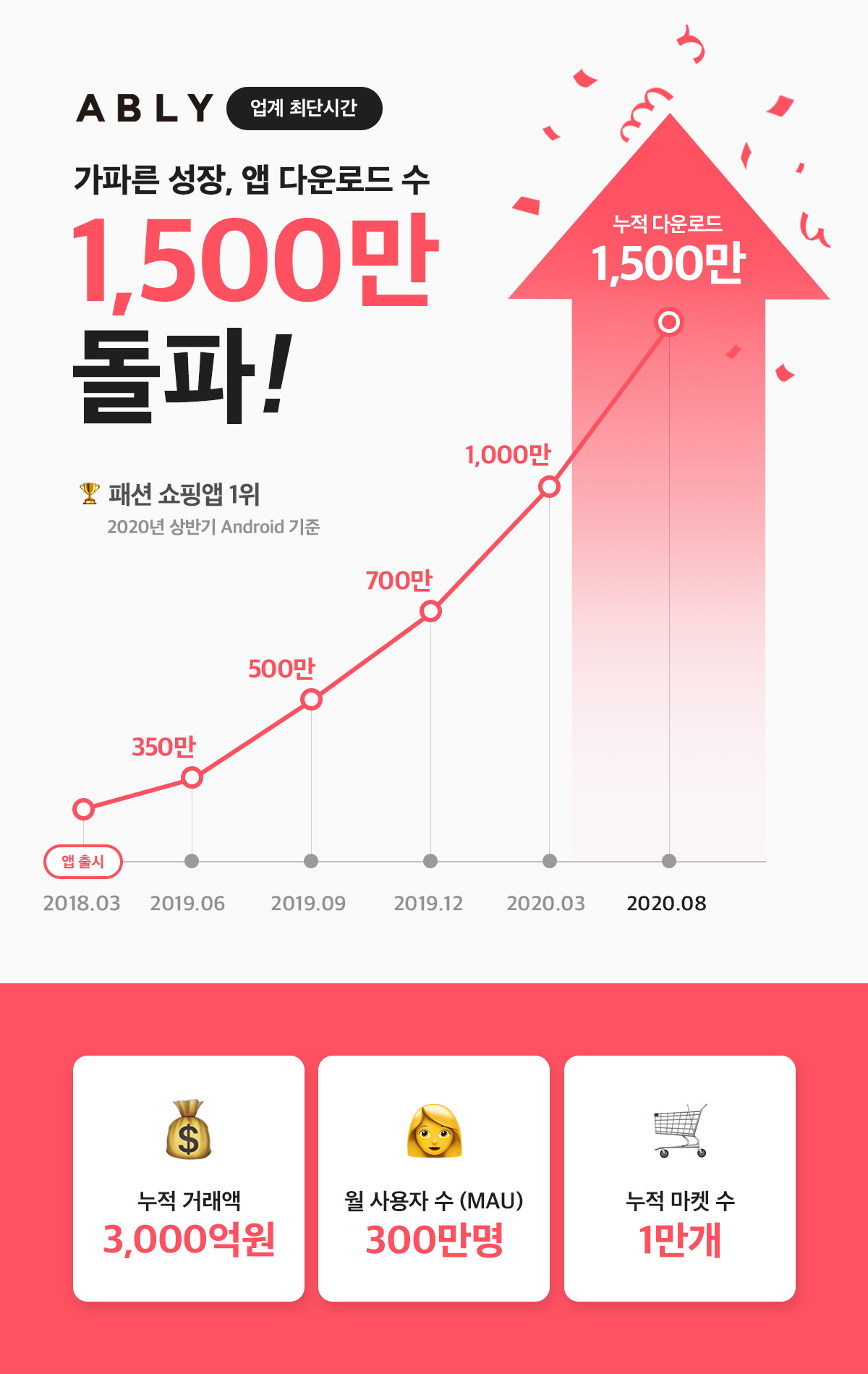 패션 쇼핑앱 ‘에이블리’가 누적 다운로드 수 1,500만을 돌파했다.