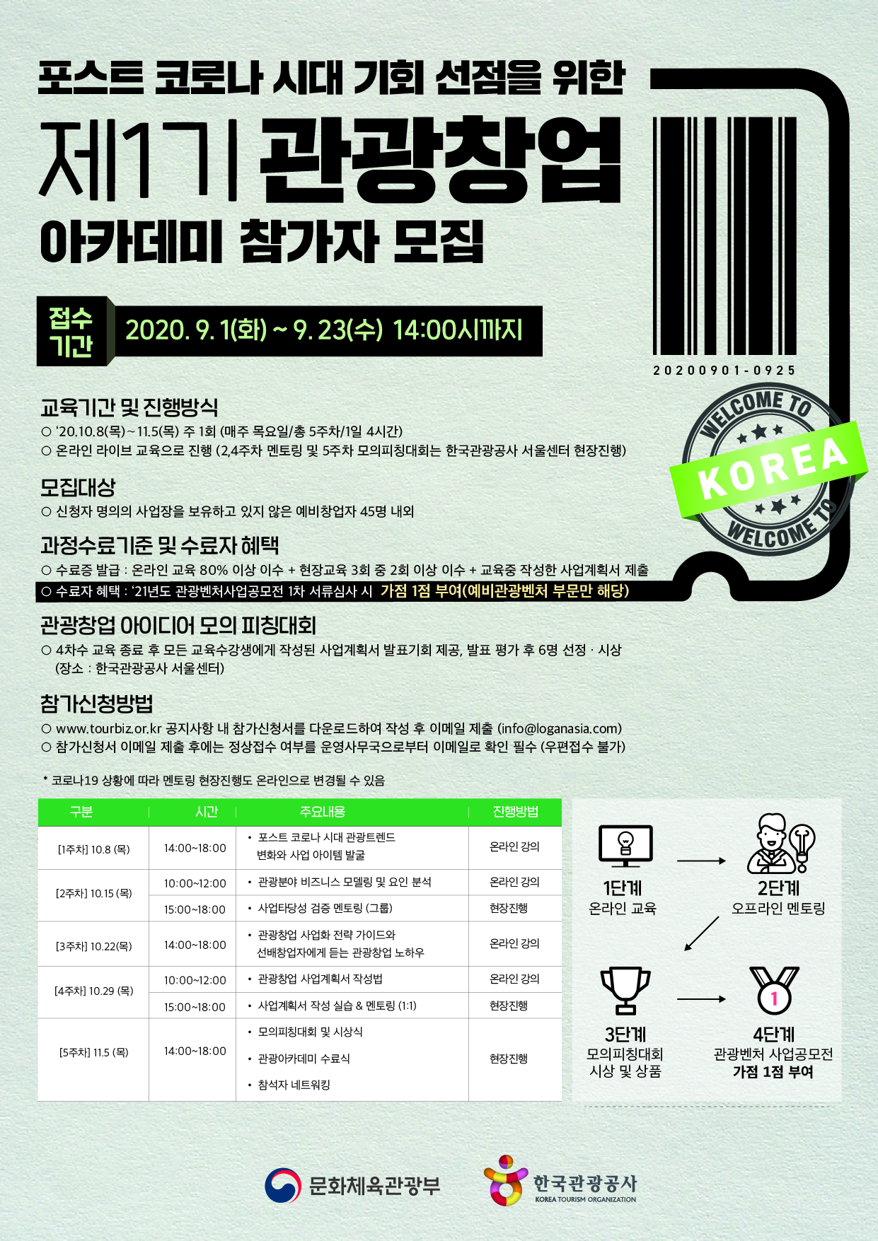 접수 기간은 9월 1일부터 23일까지이며 10월 8일부터 11월 5일까지 매주 목요일 진행될 예정이며, 포스트코로나 시대 관광트렌드 및 상품기획, 비즈니스 모델, 사업화 전략 강연 및 전문가 멘토링, 모의피칭대회 등의 프로그램이 온라인 라이브 교육으로 진행될 예정이다. 2주차, 4주차 멘토링 및 5주차 모의피칭대회는 현장진행을 계획하고 있으나, 코로나19 상황에 따라 온라인으로 진행할 수 있다고 전했다.