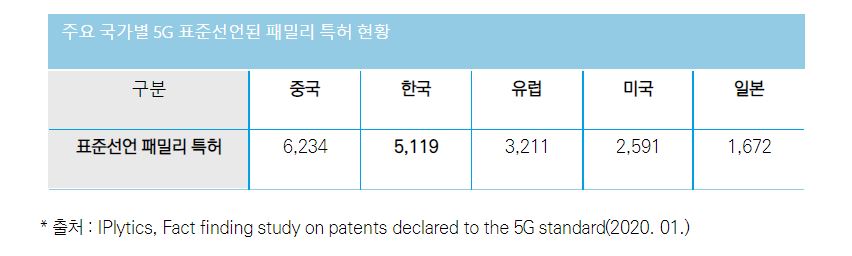 동 보고서에 따르면 우리나라의 5G 관련 표준 선언된 패밀리 특허 규모*는 5,119건으로 중국(6,234건)에 이어 두 번째로 많은 비중을 차지하는 것으로 나타났다(2020년 1월 1일 기준).