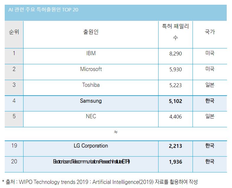 AI 분야에서는 AI 관련 특허출원 활동 급증과 특허침해소송 등을 통한 시장영향력 확보 경쟁이 두드러지는 가운데, 삼성, LG, ETRI(한국전자통신연구원) 등이 AI 관련 주요 특허출원인 TOP 20에 이름을 올리고 있는 것으로 나타났다.
