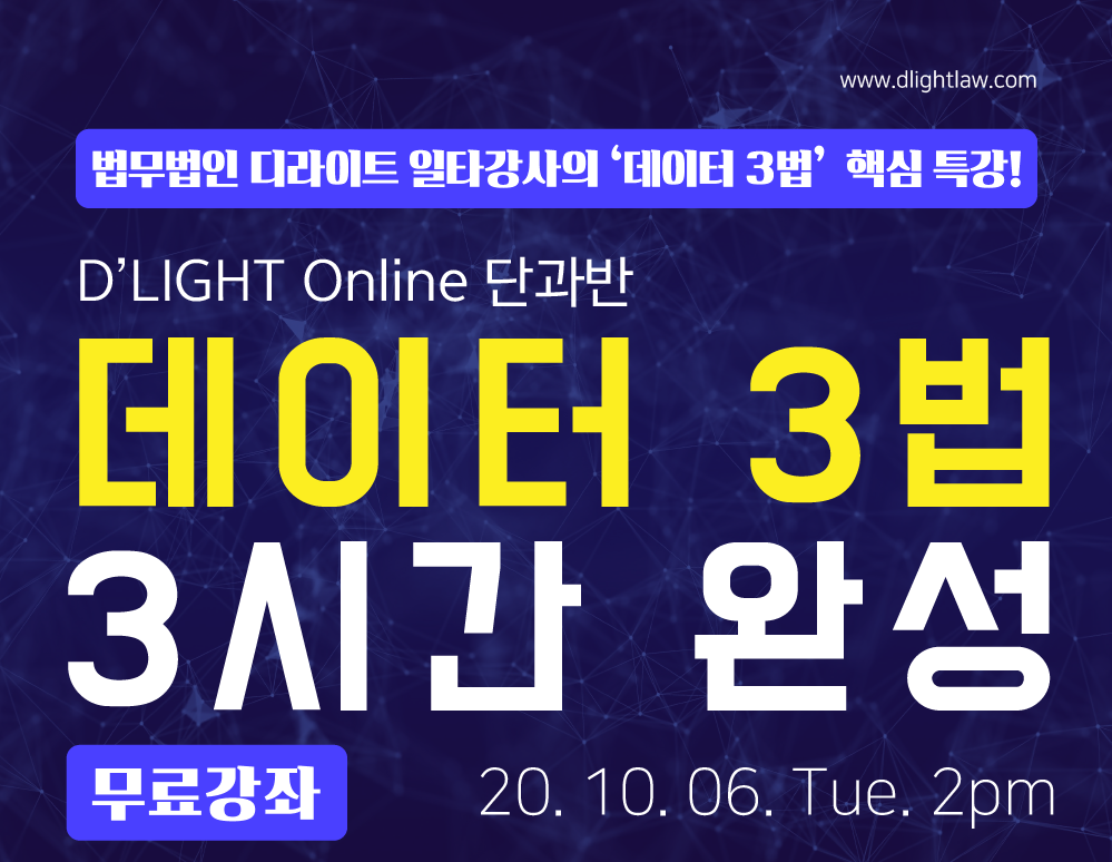 법무법인 디라이트가 주최하는 데이터 3법 3시간 완성이 오는 10월 6일 14시에 진행된다. 이번 행사는 데이터 3법 시행에 따른 동향과 변화, 발전 상황을 살펴보고, 비즈니스의 핵심으로 떠오른 데이터 활용과 법적 이슈에 대해 논의하는 자리다.