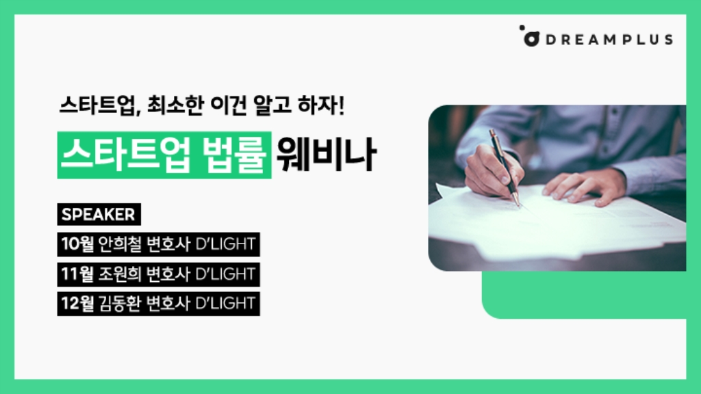 한편, 한화생명 드림플러스에서 주최하는 “스타트업, 최소한 이건 알고 하자!” 스타트업 법률 웨비나는 법무법인 디라이트와 함께하며 11월과 12월에도 진행된다. 11월에는 법무법인 디라이트 조원희 변호사가 연사로 특금법 시행과 블록체인 산업의 규제 변화 동향을, 12월에는 법무법인 디라이트 김동환 변호사가 연사로 기술/특허/영업비밀/직무발명을 주제로 강의를 한다. 웨비나에 대한 자세한 내용 확인과 참가 신청은 이곳에서 할 수 있다.