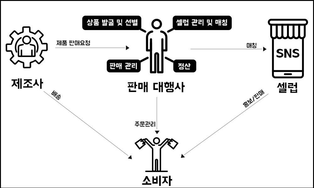 SNS 판매 과정에서 판매대행사는 상품을 선별하고 셀럽을 매칭하여 관리하는 동시에 셀럽이 판매한 상품의 관리부터 정산까지 많은 업무를 담당한다.