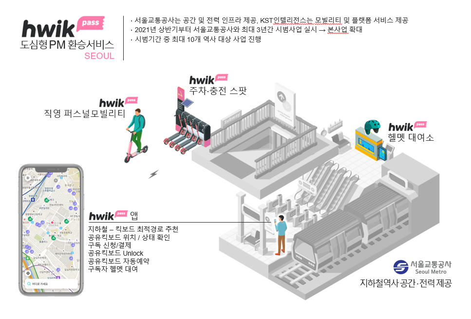 MaaS 전문기업 KST인텔리전스가 서울교통공사와 함꼐 서울 지하철과 공유 전동킥보드 간의 통합 교통서비스(MaaS : Mobility as a Service)를 본격 구현하는 사업에 나선다고 밝혔다.