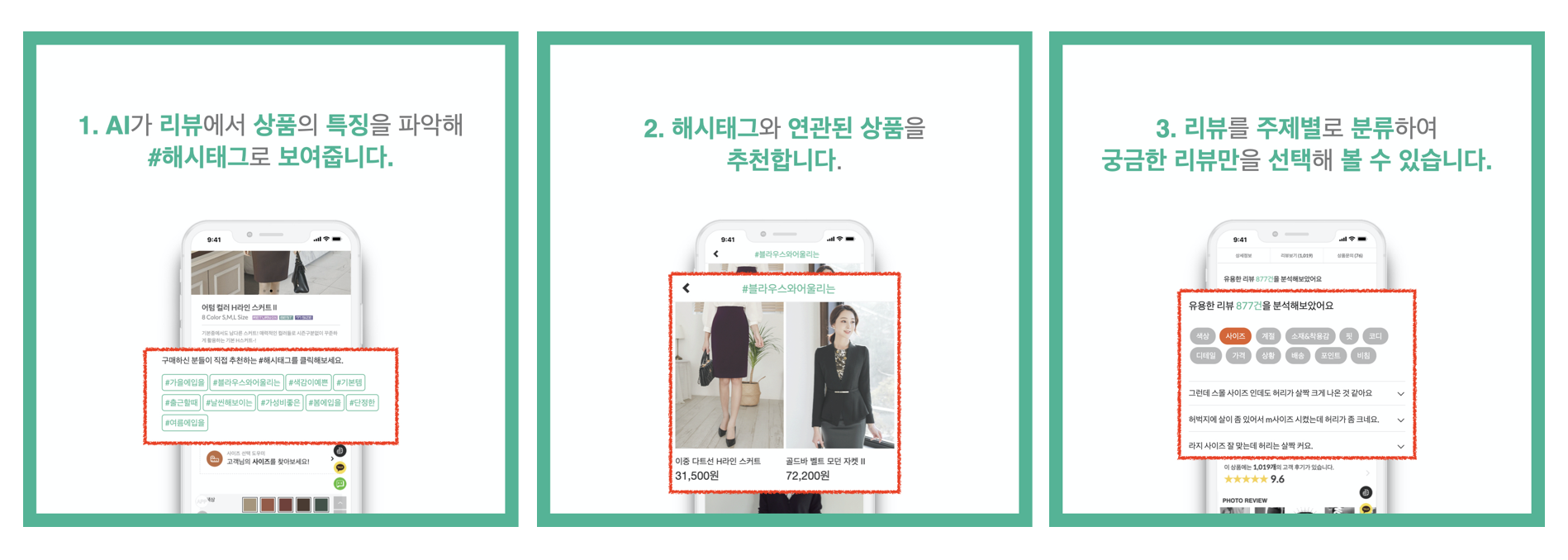 빌리뷰는 투자 유치와 더불어 첫 서비스로 ‘리뷰 큐레이션 위젯’을 출시했다. 리뷰 큐레이션 위젯 서비스는 쇼핑몰에 올라온 리뷰를 자연어처리 기술로 요약해 보여주는 서비스다. 구매자가 언급하는 상품의 장점을 해시태그 형식으로 보여주고, 이를 기반으로 연관 상품도 추천해준다.