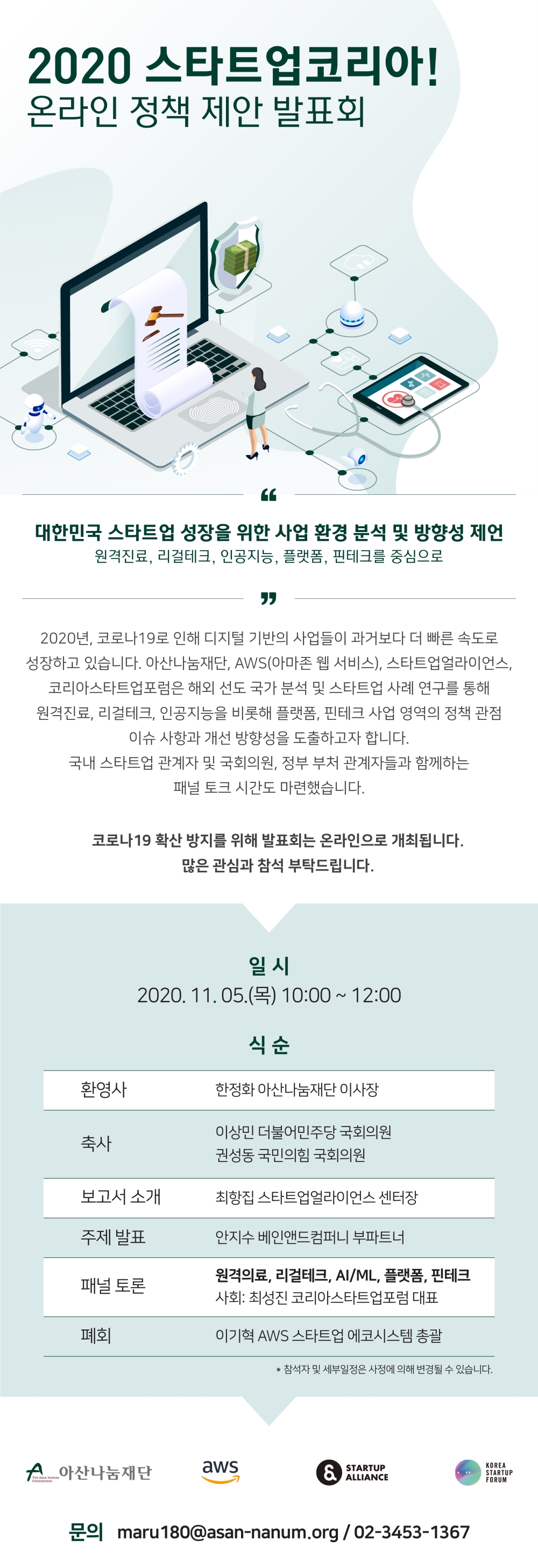 ◇ [11월 5일 목요일] = 2020 스타트업코리아! 온라인 정책 제안 발표회 = 아산나눔재단과 아마존 웹 서비스(AWS), 스타트업얼라이언스, 코리아스타트업포럼이 함께하는 2020 스타트업코리아! 온라인 정책 제안 발표회가 오는 11월 5일 10시에 진행된다. 온라인 웨비나로 진행되는 이번 행사는 해외 선도 국가 분석 및 스타트업 사례 연구를 통해 원격진료, 리걸테크, 인공지능을 비롯해 플랫폼, 핀테크 사업 영역의 정책 관점 이슈 사항과 개선 방향성을 도출하고자 마련됐다. 이번 행사에는 △최항집 스타트업얼라이언스 센터장의 보고서 소개 △안지수 베인앤드컴퍼니 부파트너의 주제 발표 이외에도 국내 스타트업 관계자 및 국회의원, 정부 부처 관계자들과 함께하는 패널 토크도 진행될 예정이다. 패널 토론은 원격의료, 리걸테크, AI/ML, 플랫폼, 핀테크를 주제로 진행되며, 사회는 △최성진 코리아스타트업포럼 대표가 맡는다. 이번 행사는 관심 있는 누구나 참여 가능하다. 웨비나에 대한 자세한 내용 확인과 참가 신청은 이곳에서 할 수 있다.