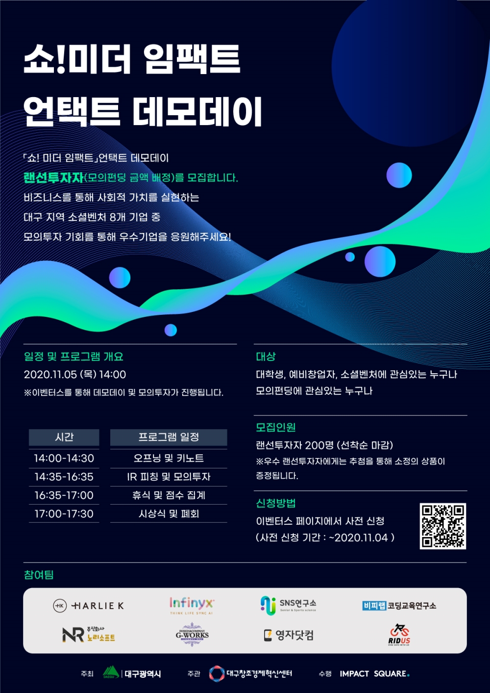 ◇ [11월 5일 목요일] = 쇼!미더 임팩트 언택트 데모데이 = 대구광역시가 주최하고, 대구창조경제혁신센터가 주관하며, 임팩트 스퀘어(IMPACT SQUARE)가 수행 기관으로 참여하는 쇼!미더 임팩트 언택트 데모데이가 오는 11월 5일 목요일 14시에 진행된다. 온라인 웨비나로 진행되는 이번 행사는 비즈니스를 통해 사회적 가치를 실현하는 대구 지역 소셜벤처 8개 팀 중 모의 투자 기회를 통해 우수 기업을 응원하는 자리다. 행사 참가자는 온라인으로 소셜벤처 기업들의 발표를 듣고 관심 있는 팀에게 직접 모의 펀딩을 할 수 있다. 전문가 심사 및 온라인 펀딩 점수를 합산해 최고점 기업이 선정된다. 이번 행사는 대학생, 예비 창업자, 소셜벤처, 모의 펀딩에 관심 있는 누구나 참여 가능하다. 웨비나에 대한 자세한 내용 확인과 참가 신청은 이곳에서 할 수 있다.