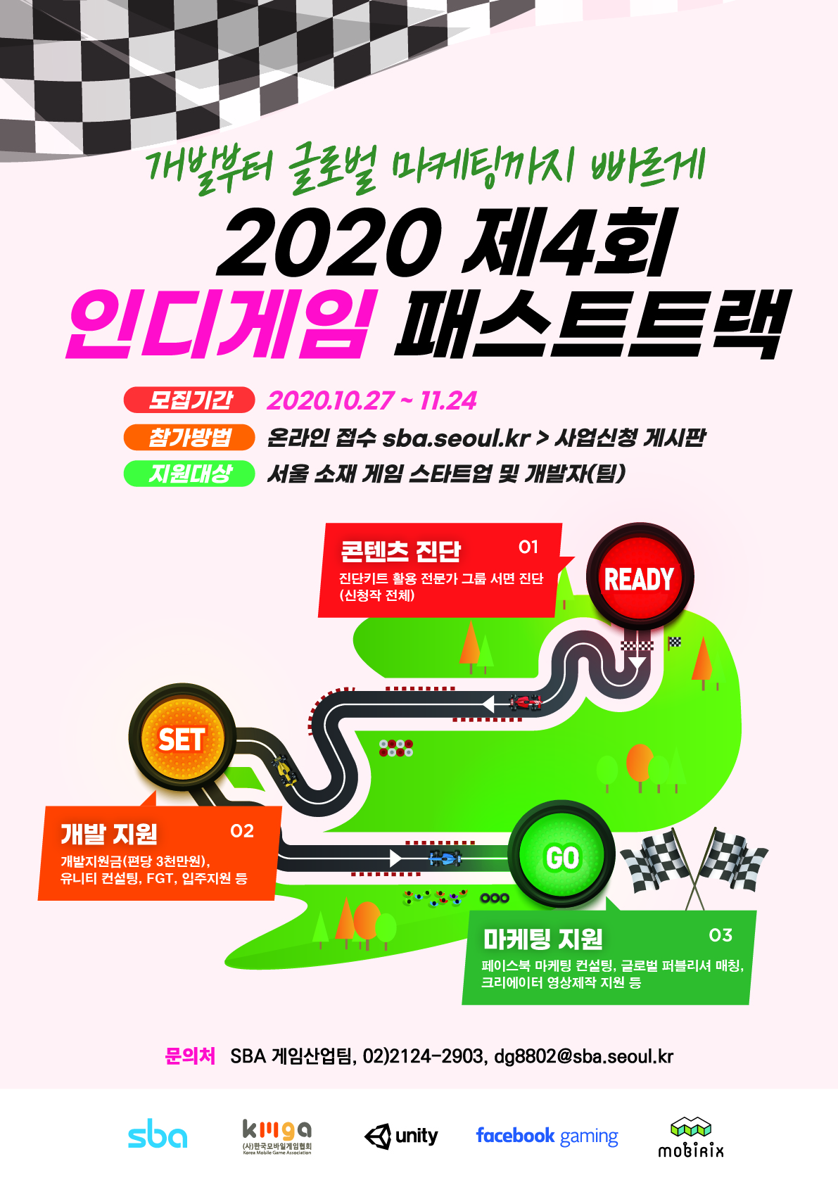 서울시와 서울시 일자리 창출의 주역인 중소기업지원기관 SBA(서울산업진흥원)는 인디게임 특화 종합 성장지원체계 ‘2020 제4회 SBA 인디게임 패스트트랙’의 참가기업을 오는 11월 24일까지 모집한다고 밝혔다.