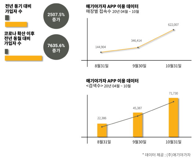키즈 액티비티 플랫폼 애기야가자(대표 오세정)가 2020년 1월부터 10월까지 자사 서비스 가입자가 전년 동기 대비 2507% 증가했다고 밝혔다.