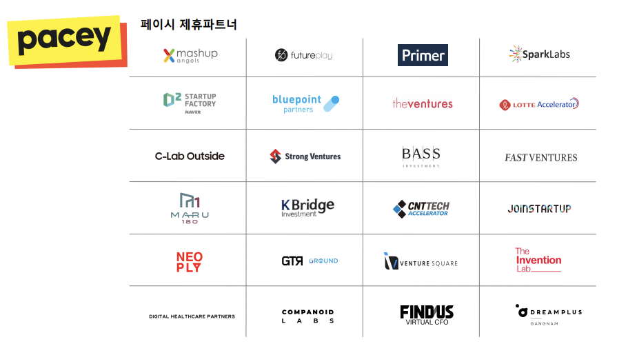 현재까지 페이시와 제휴한 파트너는 프라이머, 스파크랩스, 퓨처플레이, 블루포인트파트너스 등 스타트업 액셀러레이터 16개사, 스트롱벤처스, 베이스인베스트먼트 등 초기 벤처캐피탈 4개사, 마루180, 한화드림플러스강남 등 입주지원기관 등 4개사로 총 24개의 창업지원기관이다.