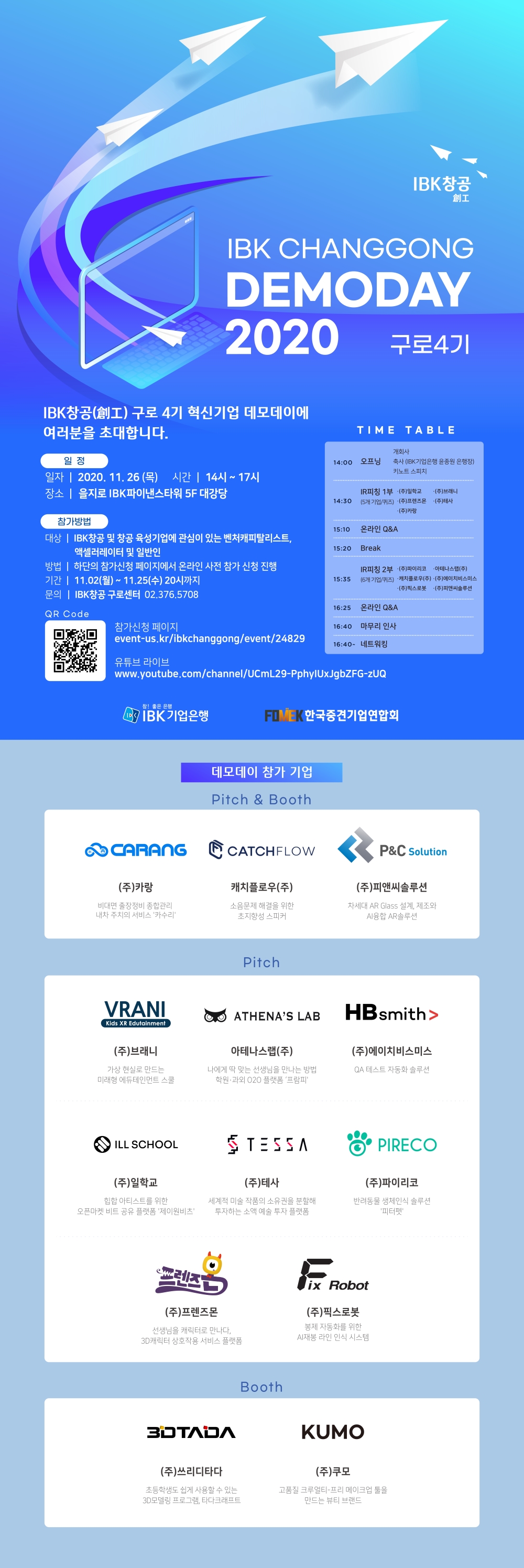 IBK기업은행이 주최하는 2020 IBK 창공 구로4기 데모데이가 오는 11월 26일 목요일 13시 50분에 진행된다. 온라인 웨비나로 진행되는 이번 행사는 IBK창공 및 창공 육성기업에 관심이 있는 VC, 액셀러레이터 및 일반인이라면 누구나 참여 가능하다.