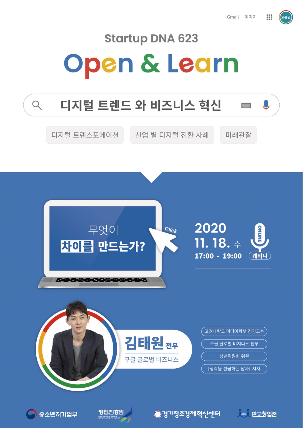 중소벤처기업부, 창업진흥원, 경기창조경제혁신센터, 판교창업존이 함께하는 Start up DNA 623 오픈런 <디지털 트렌드와 비지니스 혁신>이 오는 11월 18일 수요일 17시에 진행된다. 온라인 웨비나로 진행되는 이번 행사는 변화하는 시대에 맞춰 스타트업이 맞춰가야 할 디지털 트렌드를 알아볼 수 있는 특강이다. 이번 행사에는 구글글로벌 비즈니스 김태원 전무가 연사로 나서 디지털 트렌드에 맞춘 비즈니스 혁신 방법에 대한 강연을 진행한다. 이번 행사의 강연 주제는 ‘디지털 트렌드와 비즈니스 혁신 : 무엇이 차이를 만드는가?’로, 디지털 트랜스포메이션 시대, 산업별 디지털 전환 사례를 살펴보며 함께 트렌드를 알아볼 예정이다.