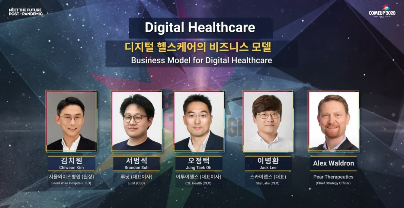서울 와이즈병원의 김치원 원장이 좌장으로, 간단한 자기소개가 이뤄졌다. 의료 인공지능 소프트웨어 개발사인 루닛의 서범석 대표(이하 서 대표), 원격 질병관리 서비스인 E2E 헬스의 오정택 대표이사(이하 오 이사), 바이오 및 의료 모니터링 서비스를 제공하는 스카이랩스 이병환 대표(이하 이 대표)가 참석했으며, 디지털 치료제 개발사인 피어 테라퓨틱스(Pear Therapeutics)의 최고전략책임자 (Chief Strategy Officer)인 알렉스 월드런 (Alex Waldron)이 메시지를 보내왔다.