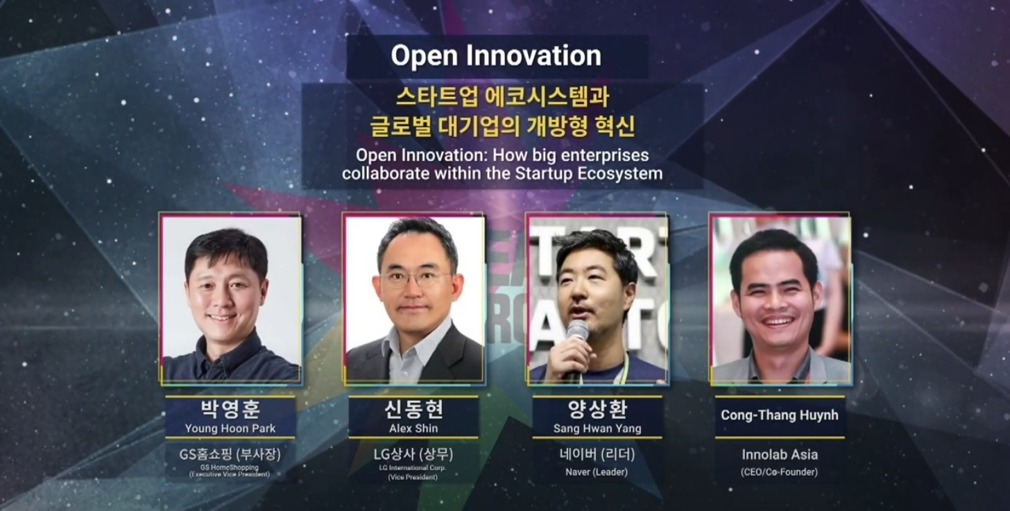 행사 둘째 날인 오픈 이노베이션(Open Innovation) 세션 패널 토의에서는 ‘스타트업 에코시스템과 글로벌 대기업의 개방형 혁신(Open Innovation: How big enterprises collaborate within the Startup Ecosystem)’을 주제로 의견이 오갔다. 박영훈 GS 홈쇼핑 부사장이 좌장으로, 신동헌 LG상사 상무, 양상환 네이버 리더, Cong-Thang Huynh 이노랩 아시아 CEO/Co-Founder가 패널로 참여했다.
