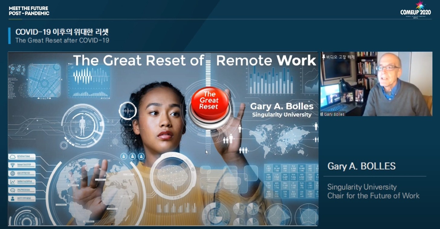 20일 글로벌 스타트업 행사 ‘컴업 2020’에서 진행된 ‘리모트 워크(Remote Work)’ 세션 강연에서 Gary A. Bolles Singularity 대학 미래일자리 부문 의장은 근무 방식을 포함해 변화에 대응하는 방식에 대해 이 같이 말했다