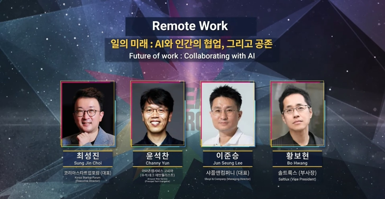 20일 글로벌 스타트업 행사 ‘Comeup(컴업) 2020’에서 ‘일의 미래 : AI와 인간의 협업, 그리고 공존(Future of work : Collaborating with AI)’를 논의해보는 패널토의가 열렸다. 원격 근무(Remote Work) 세션으로 진행된 이날 토의에는 최성진 코리아스타트업포럼 대표가 좌장으로 나섰다. 윤석찬 아마존 웹 서비스 수석 테크 에반젤리스트, 이준승 샤플앤컴퍼니(Shopl & Company) 대표, 황보현 솔트룩스 부사장이 토의에 참여했다.