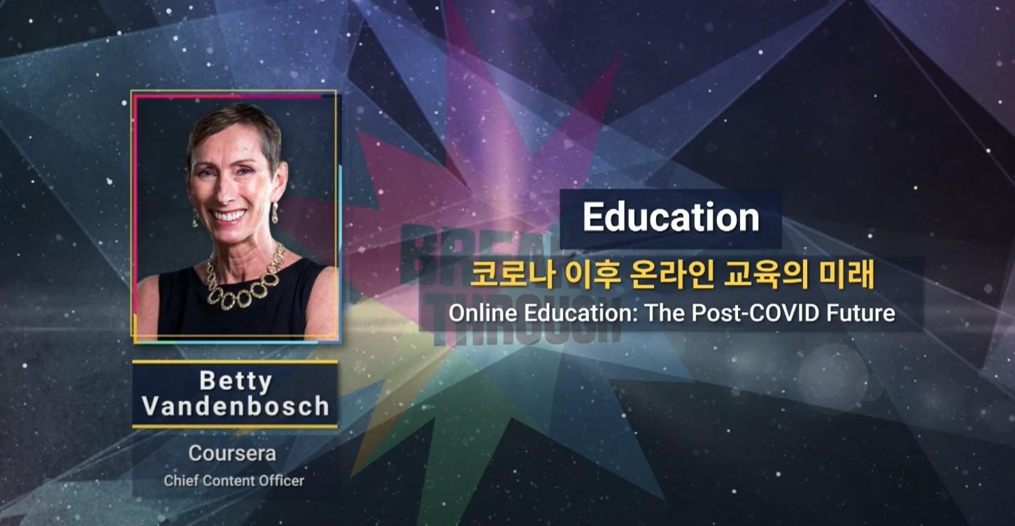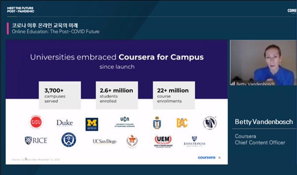 21일 컴업 2020의 마지막 날이 열렸다. 교육 부분의 아젠다 스피커로 세계적 온라인 교육 플랫폼스타트업인 코세라(Coursera)의 CCO인 베티 반덴보쉬 (Betty Vandenbosch)가 실시간으로 참여, ‘코로나 이후 온라인 교육의 미래’를 주제로 강연을 진행했다.