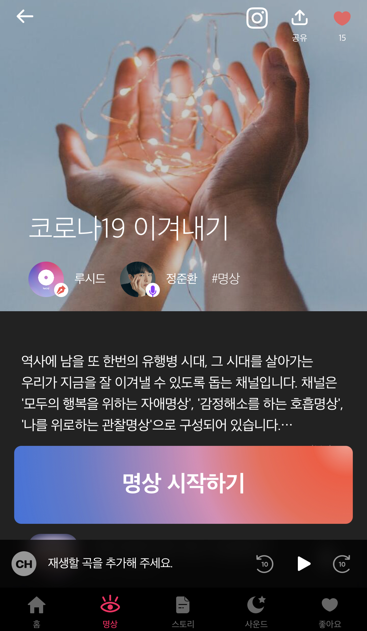 루시드 아일랜드(https://lucidisland.com/)에는 ‘코로나19 이겨내기’와 ‘코로나 시대, 스트레스 관리명상’ 두 개의 채널이 전부 무료로 공개되어 있는데, ‘코로나19 이겨내기’ 채널의 경우 ‘연애 플레이리스트 시즌 4’와 ‘연애의 참견’등에 출연한 정준환 배우의 목소리로 만나볼 수 있다.