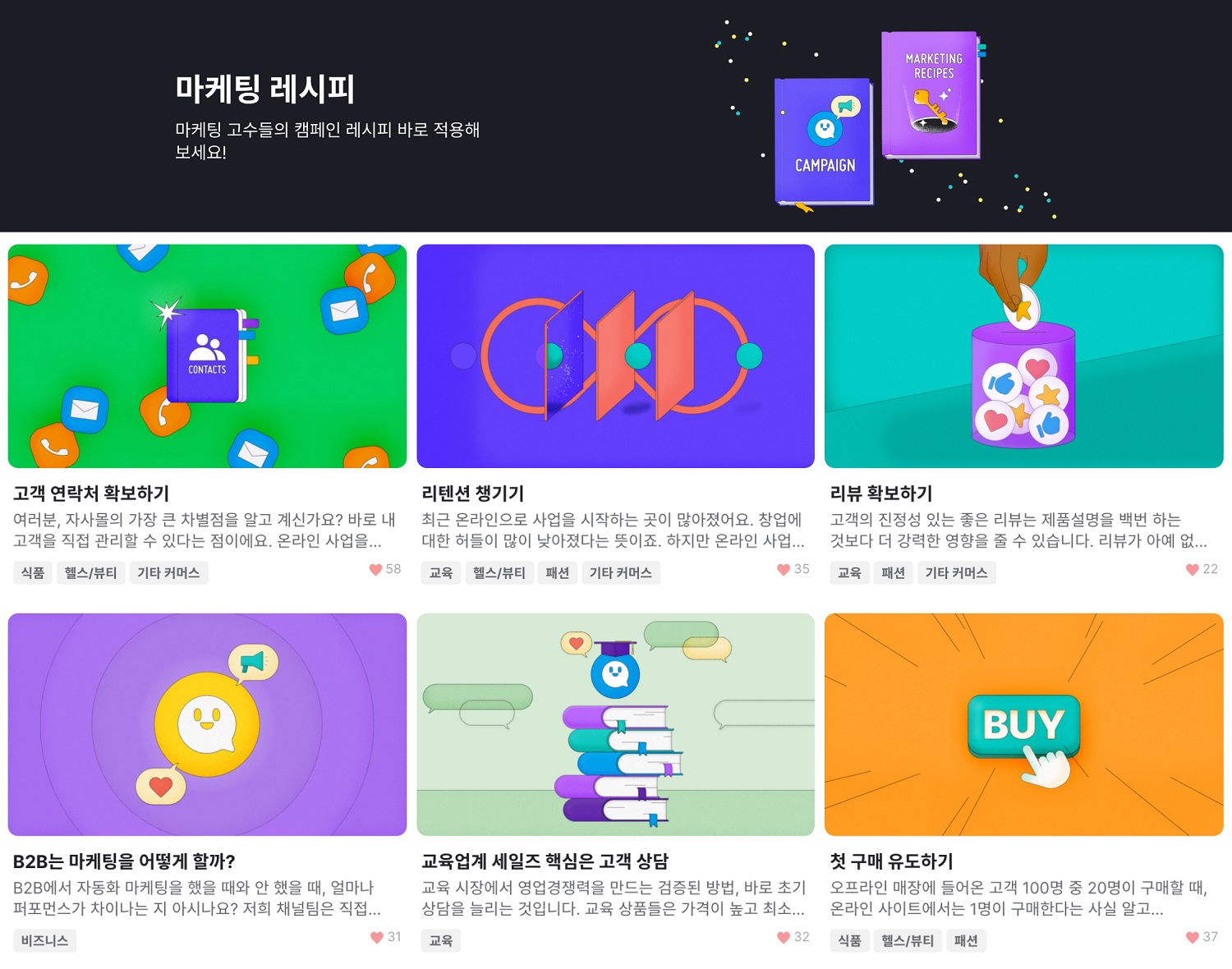 채널톡에는 현재 △객단가 높이기, △단골관리, △고객 연락처 확보하기, △리텐션 챙기기, △리뷰 확보하기, △첫 구매 유도하기, △장바구니 살리기, △B2B는 마케팅, △교육업계 세일즈 핵심 등 마케터들이 궁금해하는 9개의 레시피가 오픈돼 있다.