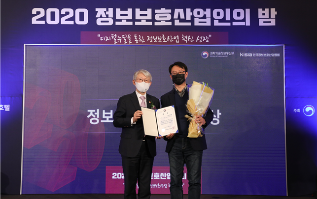 에스앤피랩(대표 이재영)은 지난 26일 2020년 정보보호 산업인의 밤 행사에서 과학기술정통부 장관상을 수상했다고 밝혔다. 과학기술정보통신부에서 주최하고 한국인터넷진흥원·SK텔레콤·GS ITM에서 공동주관한 비대면 서비스 정보보호 해커톤에서 에스앤피랩은 마이데이터와 DID(분산 ID)를 이용한 비대면 통합 무인 인증 솔루션 ‘On-Device MyData PASS’로 우승을 하게 되어 장관상 수상의 영예를 안았다.