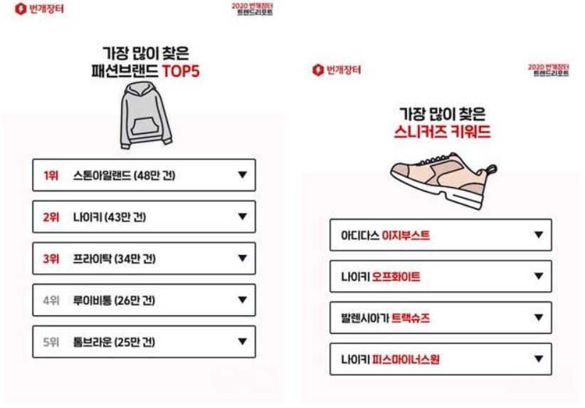 번개장터의 ‘대표 인기 거래 품목’ 스니커즈 역시 성장세를 보였다. 캐주얼화/런닝화/운동화 카테고리의 2020년 11월까지 거래 건 수는 전년 대비 약 20% 증가한 50만 건으로 스마트폰 거래량에 비견되었다. 거래액은 720억 원으로 집계되었으며, 이는 전년 대비 22% 성장한 수치다. 이는 취향과 개성을 드러내는 수단으로 패션 아이템 가운데서도 스니커즈에 대한 수요가 높아진 것으로 보이며 코로나로 인한 재택근무와 야외 활동의 증가로 편안하고 실용성을 중시하는 트렌드 및 MZ세대를 중심으로 스니커즈 리셀로 수익을 만드는 슈테크 시장의 규모가 커진 것도 영향이 있었던 것으로 분석된다.