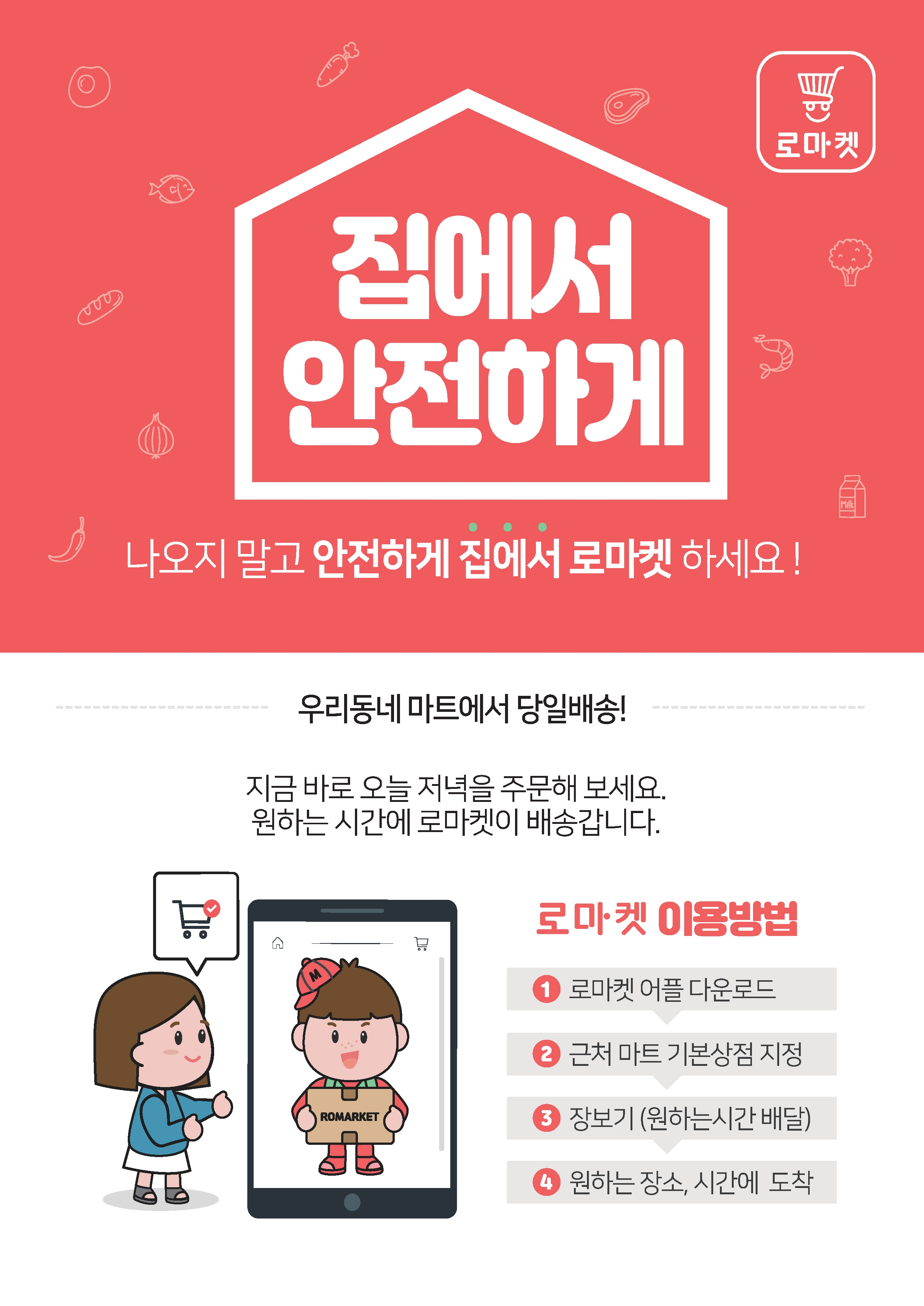 한편, 로마켓은 믿을 수 있는 집 앞 동네 마트 물건을 클릭 한번으로 단 2시간 이내에 받아볼 수 있는 동네마트 전용 배달 애플리케이션 서비스다. 별도의 물류 창고를 거치지 않고 집 근처 마트에서 바로 배달되기 때문에 기존 마트 배송 시스템 중 가장 빠른 배송이 가능하다. 특히, 동네 마트 중심으로 유통되는 질 좋은 신선제품을 더 저렴하게 구매할 수 있다.