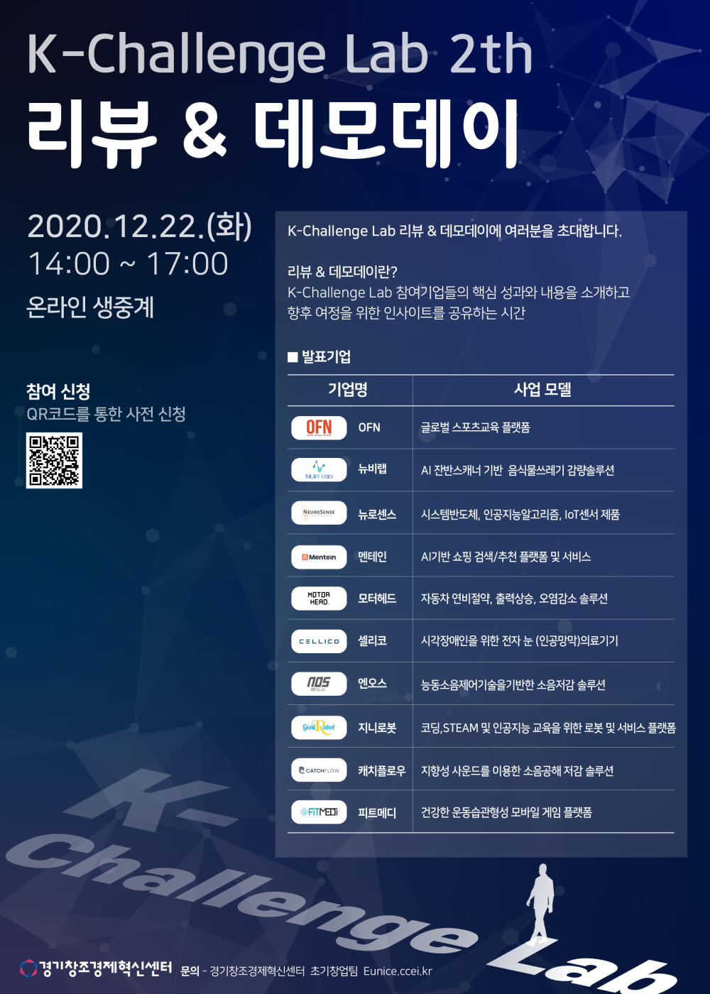 경기창조혁신센터가 주최하는 K-Challenge Lab 2기 리뷰&데모데이가 오는 12월 22일 화요일 14시에 진행된다. 이번 행사는 K-Challenge Lab 참여 기업들의 핵심 성과와 내용을 소개하고 향후 여정을 위한 인사이트를 공유하기 위해 마련되었다.