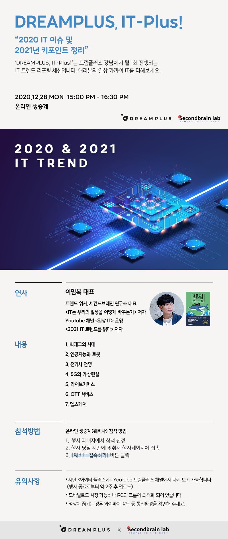 한화생명 드림플러스가 주최하는 IT PLUS가 오는 12월 28일 월요일 15시에 진행된다. 온라인 웨비나로 진행되는 이번 행사는 2020년 IT 이슈 총정리 및 2021년 관전 포인트를 주제로 한다. 이번 행사에는 트렌드 워커이자 세컨드브레인 연구소 이임복 대표가 연사로 나선다. 이번 행사에서는 빅테크의 시대, 인공지능과 로봇, 전기차 전쟁, 5G와 가상현실, 라이브커머스, OTT 서비스, 헬스케어를 주제로 IT 이슈에 대한 이야기가 진행된다. 이번 행사는 관심 있는 누구나 참여 가능하다.