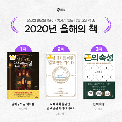 완독 지수가 높은 책들이 높은 득표를 받았다는 것도 주목할 만하다. 3위에 오른 ‘돈의 속성’은 ‘밀리 독서 리포트 2020’에서 밀리의 서재 회원들이 올해 가장 많이 읽은 책 상위 5권 중 완독할 확률이 가장 높은 책으로 분석된 바 있다. 밀리의 서재 회원들이 꼽은 올해의 책 1위~3위 모두 완독 지수가 각 책이 속한 분야의 평균을 뛰어넘는 ‘밀리 픽(밀리 회원들이 검증한 후회 없는 책)’에 속해 있다는 것도 특징이다.