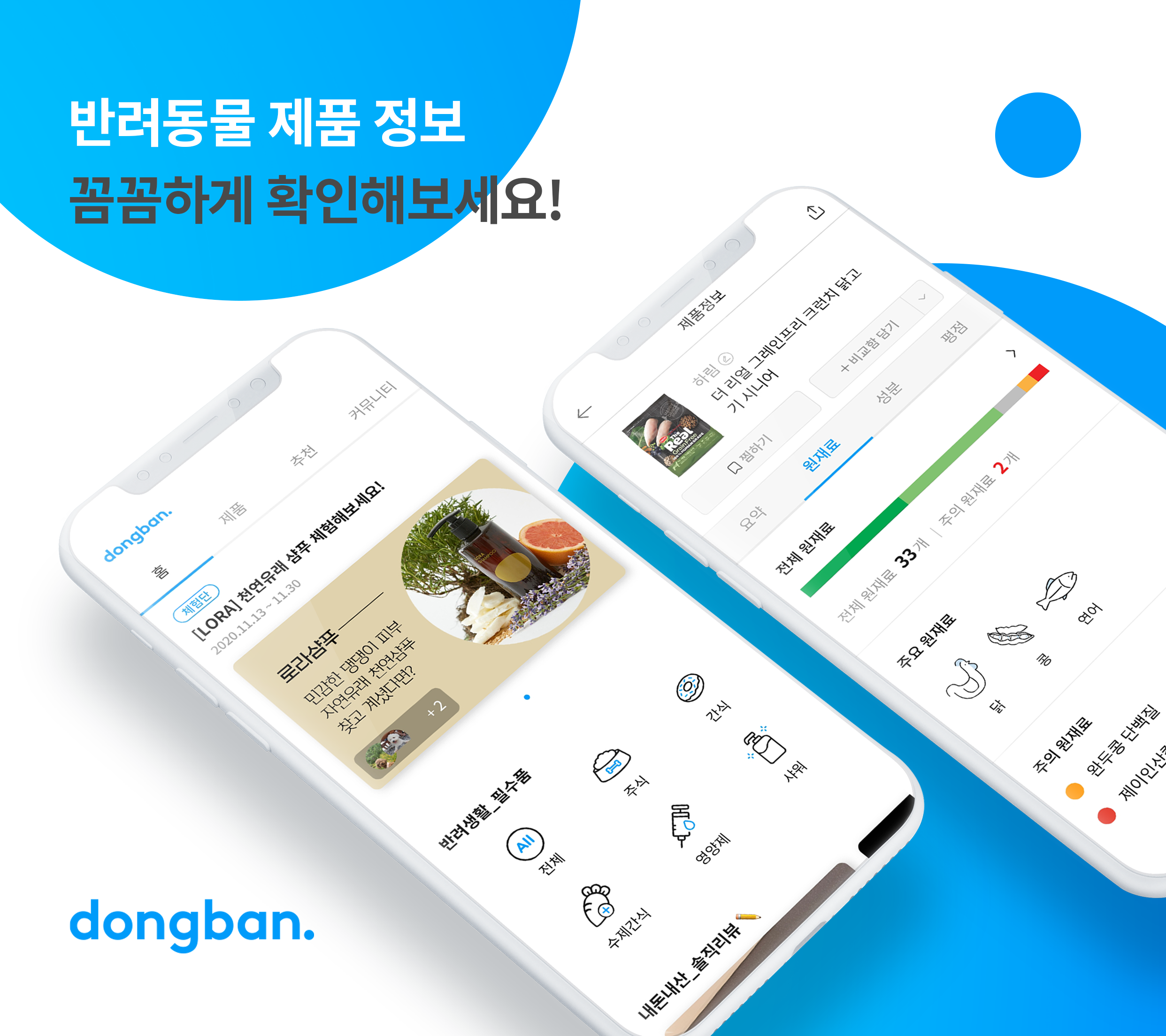 동반은 반려동물 제품 정보 플랫폼으로, 제품의 성분, 원재료, 원재료의 효능 등 다양한 정보를 소비자들에게 알기 쉽게 설명해 준다. 반려동물 식품부터, 목욕용품, 배변패드 등 다양한 카테고리의 4,000개 이상 제품에 대해 정보를 제공하고 있다.