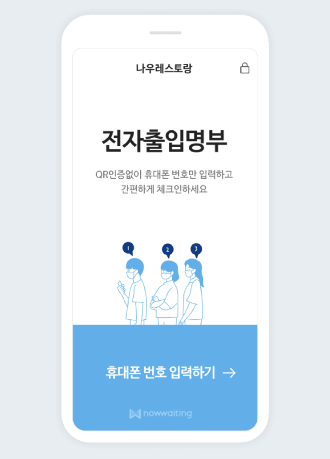 나우웨이팅 체크인은 남녀노소 누구나 쉽게 이용할 수 있는 안드로이드 기반 앱 서비스로, 출입명부 관리의 번거로움을 해소한다. 매장 입구에서 고객이 직접 나우웨이팅 체크인에 휴대전화번호만 입력하면 전자출입명부로 등록되는 것이다. 명부에 등록된 번호로 매장의 방역상태나 이용안내 등 공지사항을 모바일로 간편히 안내할 수도 있다. 서울시 등 지자체가 나우웨이팅 체크인의 손쉬운 사용성과 뛰어난 운영효율성을 인정하며 나우웨이팅 체크인을 전자출입명부로 사용해도 됨을 공식 인증했다. 나우웨이팅 체크인은 전자출입명부 기능을 무료로 제공한다.