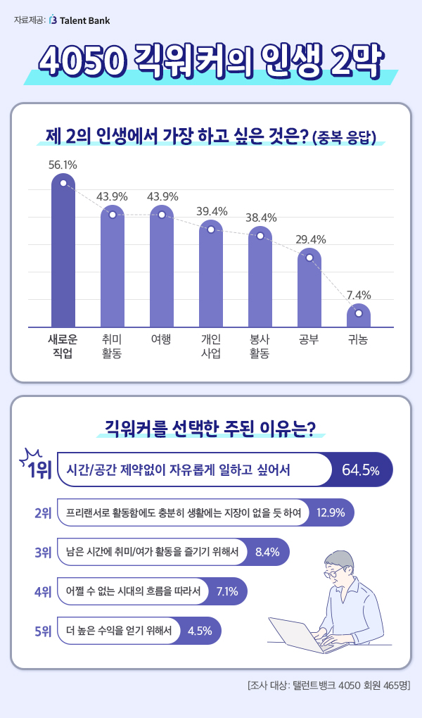 4050 긱워커들은 가장 하고 싶은 것으로 ‘새로운 직업’을 꼽았으며, 긱워커로 활동하기 위해 가장 필요한 것은 ‘관련 분야 공부’라고 답했다. 긱워커는 단기로 계약을 맺고 프로젝트 단위로 일하는 근로자를 뜻하는 말로, 디지털 플랫폼을 기반으로 한 공유경제가 확산되면서 각광받고 있는 근로 형태다.