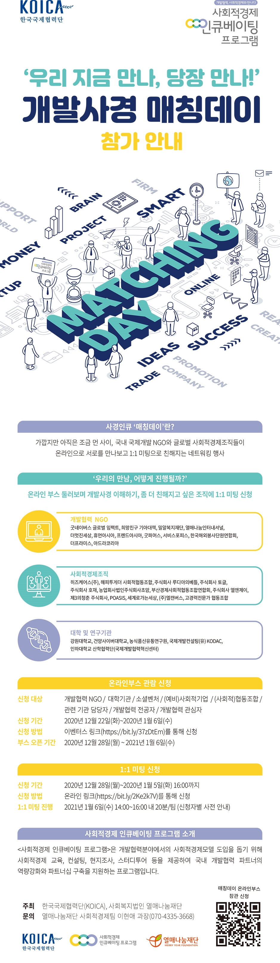 한국국제협력단(KOICA), 사회복지법인 열매나눔재단이 주최하는 개발사경 온라인 매칭데이가 오는 12월 28일 월요일부터 1월 6일 수요일까지 진행된다. 온라인 웨비나로 진행되는 이번 행사는 국내 국제개발 NGO와 글로벌 사회적경제조직들이 온라인으로 서로를 만나보고 1:1 미팅으로 만나는 네트워킹 행사다. 이번 행사에는 다수의 개발협력 NGO, 사회적경제조직, 대학 및 연구기관이 참여한다. 1:1 네트워킹은 각 조직의 온라인 부스를 둘러보며, 좀 더 가까워지고 싶은 조직에 1:1 미팅을 신청하면 된다. 이번 행사는 개발협력 NGO, 대학기관, 소셜벤처, (예비)사회적기업, (사회적)협동조합, 관련 기관 담당자, 개발협력 전공자 및 개발 협력 관심자라면 누구나 참여 가능하다.