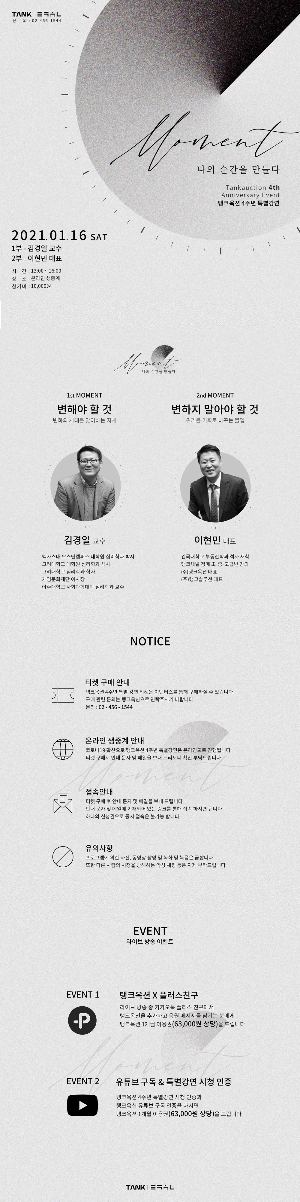 탱크옥션이 주최하는 4주년 특별 강연 : 나의 순간을 만들다가 오는 1월 16일 토요일 13시에 진행된다. 온라인 웨비나로 진행되는 이번 행사는 변화와 새로운 기회의 시대인 지금, 우리에게 필요한 것은 무엇인지 함께 이야기해 보고자 마련됐다. 이번 행사의 1부에는 김경일 교수가 연사로 참여해 ‘변해야 할 것’을 주제로 변화의 시대를 맞이하는 자세에 대한 강연을 진행한다. 이어 2부에는 이현민 대표가 연사로 나서 ‘변하지 말아야 할 것’을 주제로 위기를 기회로 바꾸는 몰입에 대해 이야기한다. 이번 행사는 관심 있는 누구나 참여 가능하다. 웨비나에 대한 자세한 내용 확인과 참가 신청은 이곳에서 할 수 있다.