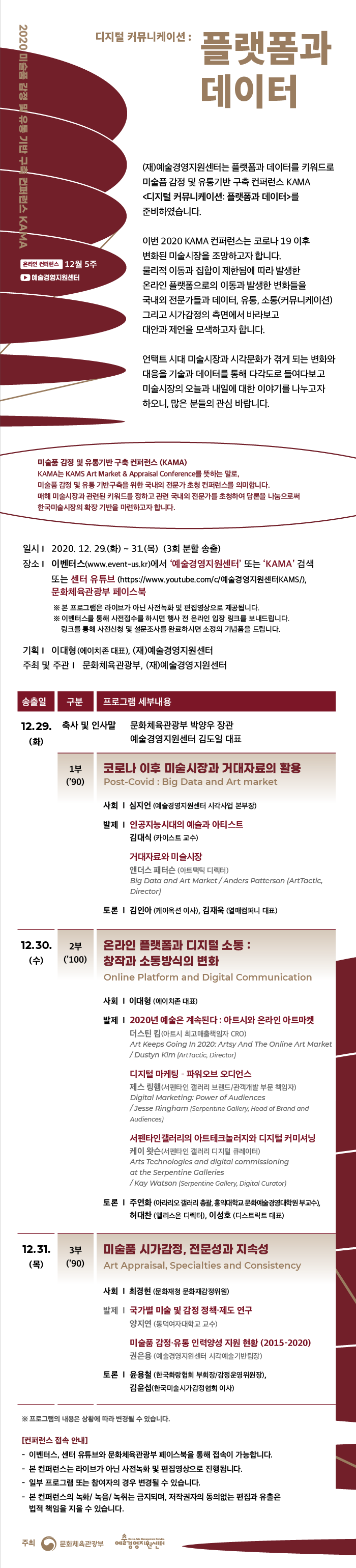 문화체육관광부와 예술경영지원센터가 주최하는 2020 미술품 감정 및 유통 기반 구축 컨퍼런스 KAMA 디지털 커뮤니케이션 : 플랫폼과 데이터가 오는 12월 29일부터 3일간 진행된다. 온라인 웨비나로 진행되는 이번 행사는 언택트 시대 미술시장과 시각문화가 겪게 되는 변화와 대응을 기술과 데이터를 통해 다각도로 들여다보고 미술시장의 오늘과 내일에 대한 이야기를 나누고자 마련됐다. 이번 행사의 1부인 29일 화요일에는 ‘코로나 이후 미술 시장과 거대 자료의 활용’을 주제로 발제 및 토론이 진행된다. 이어 이튿날인 30일 수요일은 2부로 ‘온라인 플랫폼과 디지털 소통 : 창작과 소통방식의 변화’를 주제로 발제 및 토론이 이어진다. 마지막 날인 31일 목요일 3부에는 ‘미술품 시가감정, 전문성과 지속성’을 주제로 발제 및 토론이 마련되어 있다.
