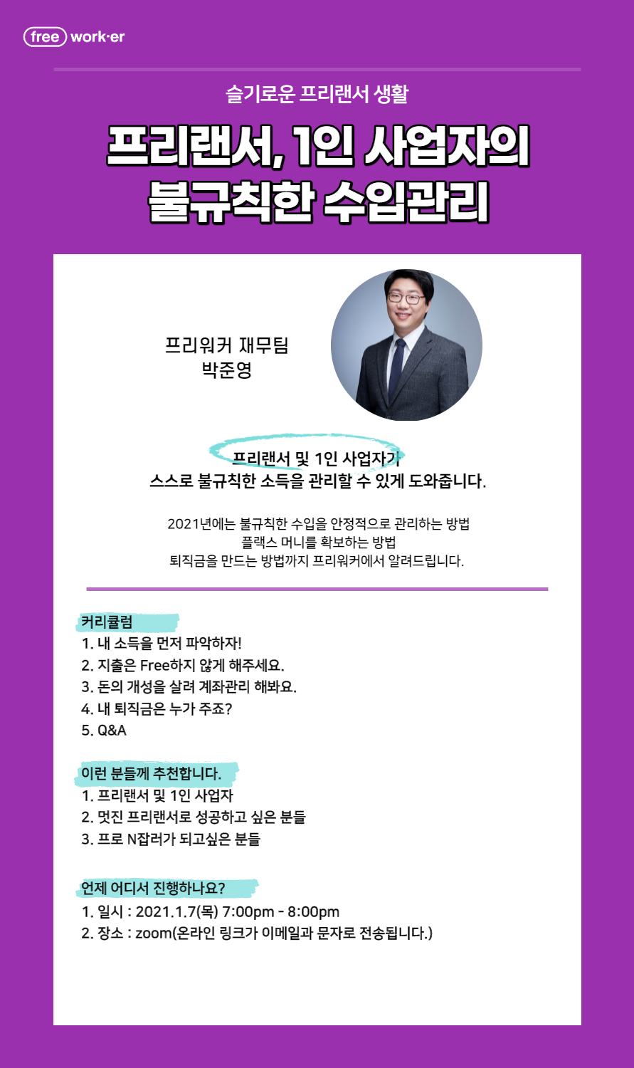 프리워커(by피플컴퍼니)가 주최하는 2021년 부자되기 프로젝트가 오는 1월 7일 목요일 19시에 진행된다. 온라인 웨비나로 진행되는 이번 행사는 프리랜서 및 1인 사업자를 위한 행사로 스스로 불규칙한 소득을 관리할 수 있도록 돕기 위해 마련됐다. 이번 행사에는 불규칙한 수입을 안정적으로 관리하는 방법, 예비 자금을 확보하는 방법, 퇴직금을 만드는 방법까지 프리랜서와 1인 사업자를 위한 강연이 진행된다. 이번 행사는 관심 있는 프리랜서 및 1인 사업자라면 누구나 참여 가능하다.